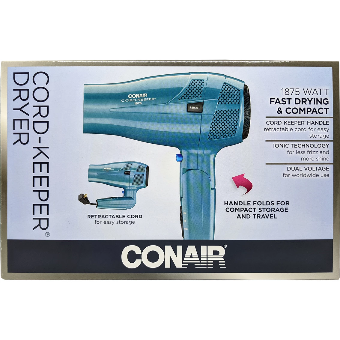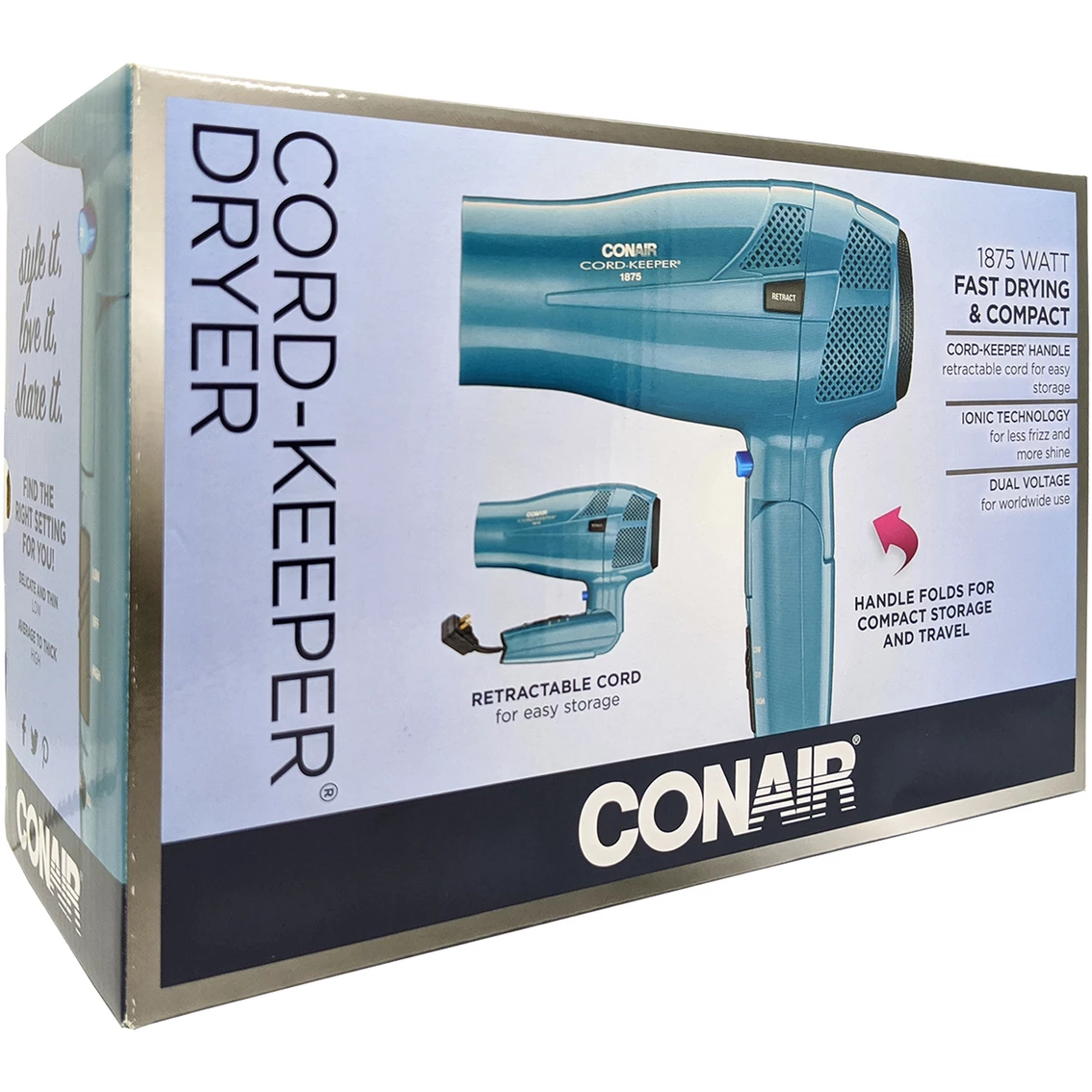 The Conair Cord Keeper Styler Hair Dryer includes 1875 watts. Ionic conditioning helps promote less frizz. The styler has a retractable line cord with push button control while staying powerful and lightweight. Cool shot locks style in place. Includes folding handle for easy storage and portability. Model: 289R.