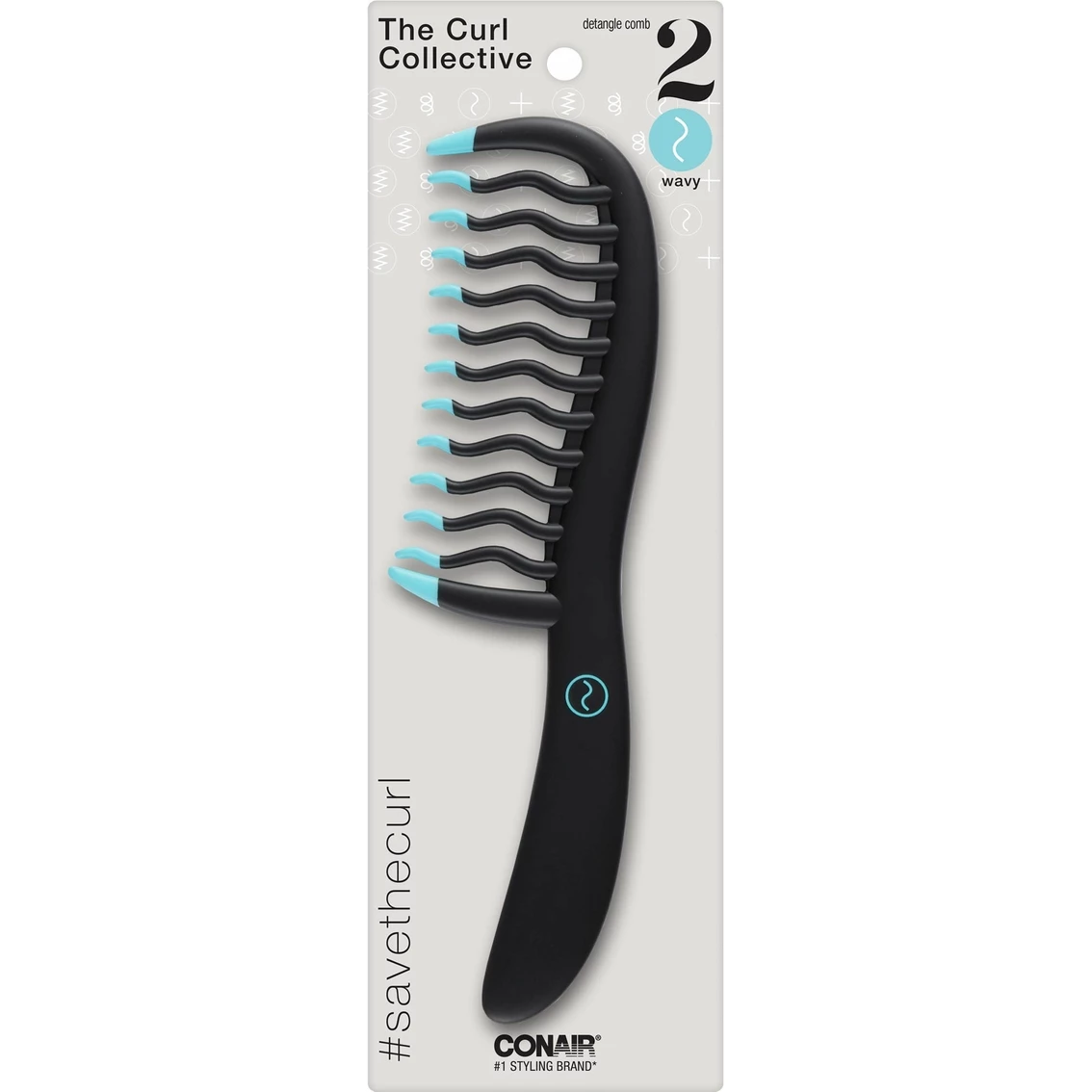 The Conair Curl Collective Wavy Comb is custom-designed to gently detangle wet or dry wavy hair. Curved teeth are precisely sized and spaced for your curl type. Defines and enhances waves while detangling. The comb is sleek and durable, with a matte black finish. Model: 93191.