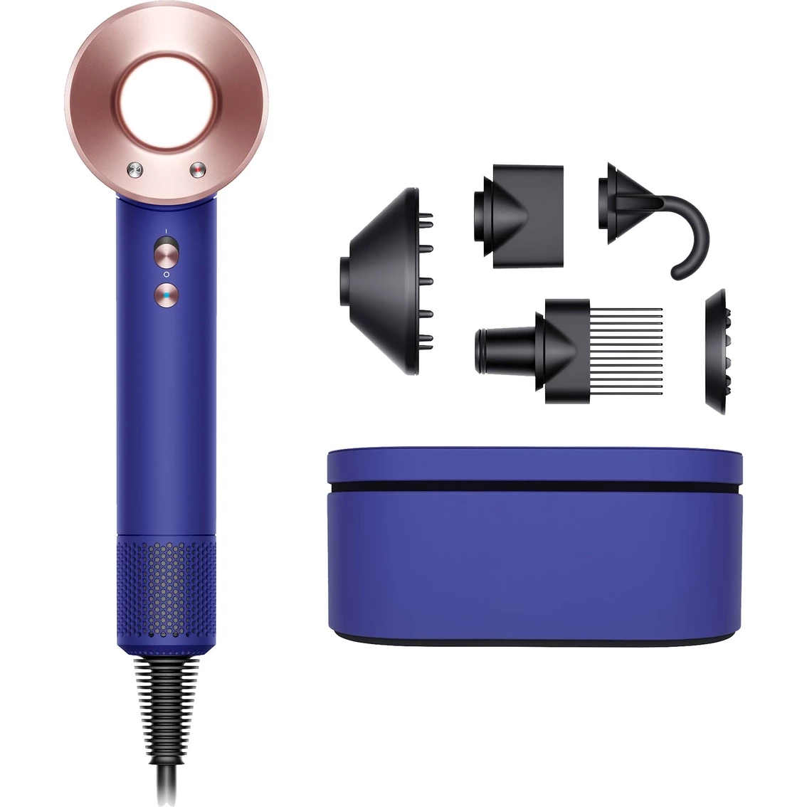 The Dyson Supersonic hair dryer is engineered to protect hair from extreme heat damage for fast drying and precision styling. The small, powerful Dyson digital motor V9 combined with Air Multiplier technology produces a high-pressure, high-velocity jet of controlled air, for fast drying and precision styling. Model: 426076-01.