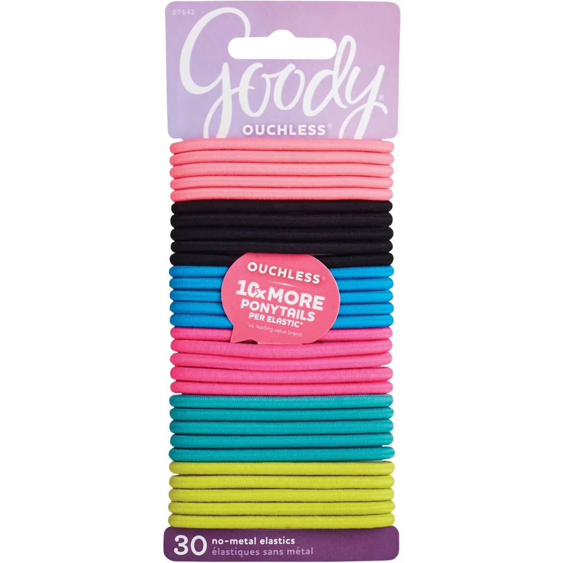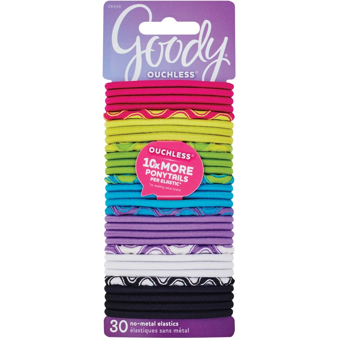 Ponytails Ouchless Hair Tie Elastics from Goody. These no-metal elastics won’t pull or snag hair, giving you all-day comfort. With a secure hold, it’s perfect for long-lasting ponytails, top knots, braids and more. Model: 1941969.