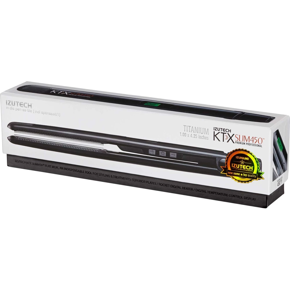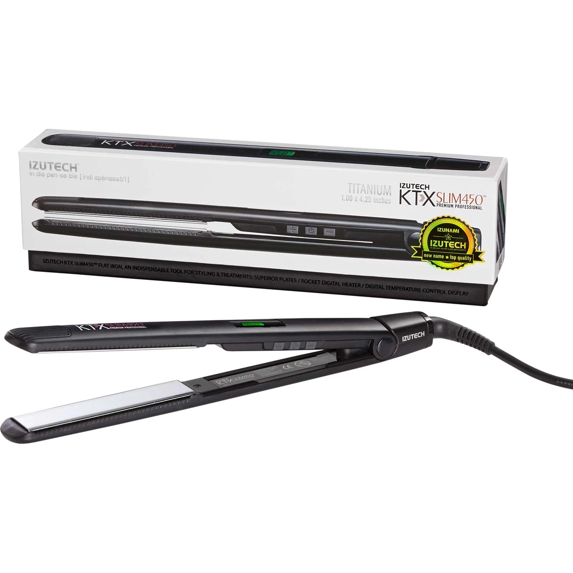 The Izutech Slim 450 Titanium Flat Iron is designed for the styling specialist who prefers 1 in. plates that are highly effective for working on larger sections of hair to reduce time. The titanium plates are extremely durable and are resistant to chemical corrosion, thus increasing the effectiveness and life of the flat iron. Model: PRFLSL10TTBK.