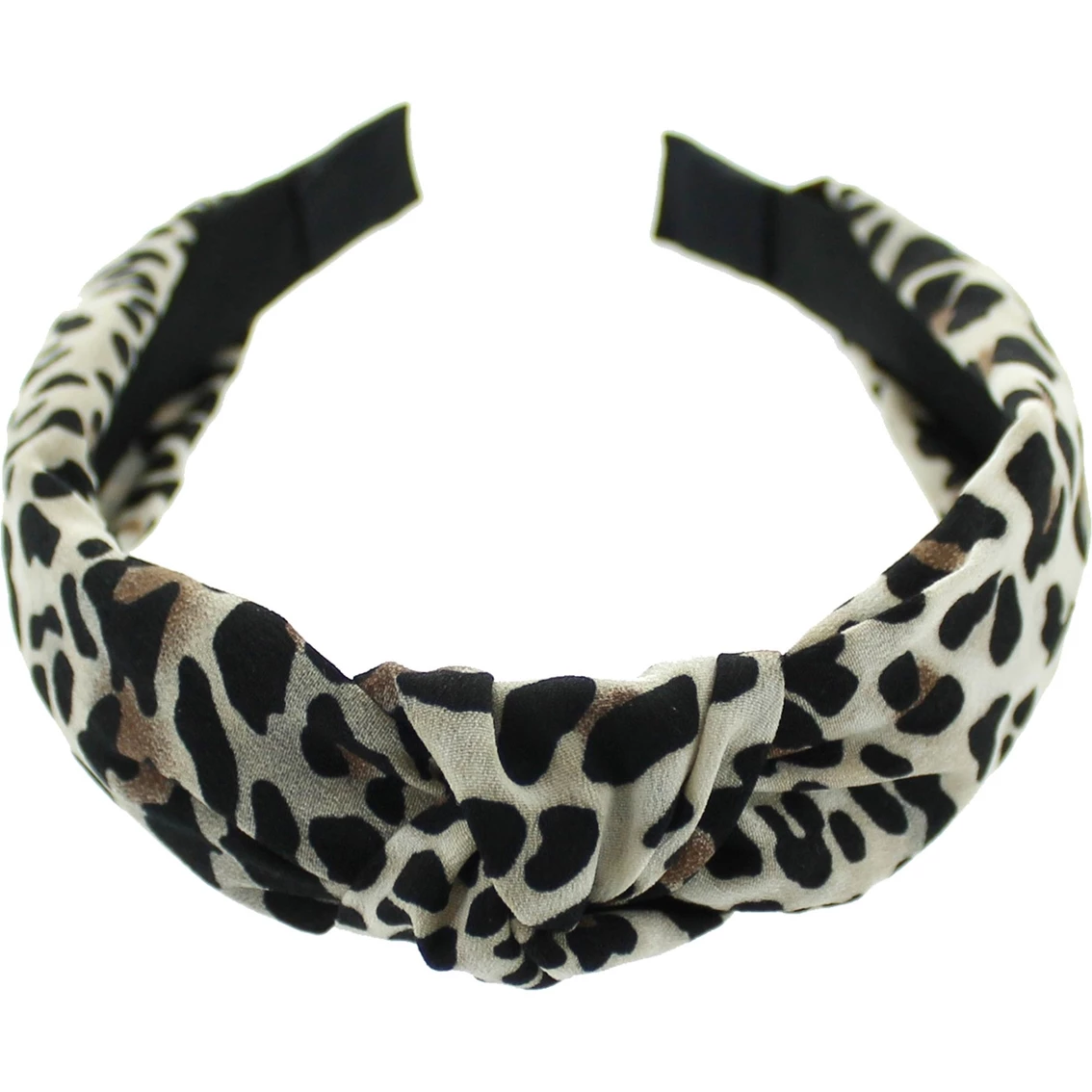 Panacea Cheetah Print Headband is a plastic headband wrapped in black and white cheetah print fabric with a knot at the top. One size fits all.