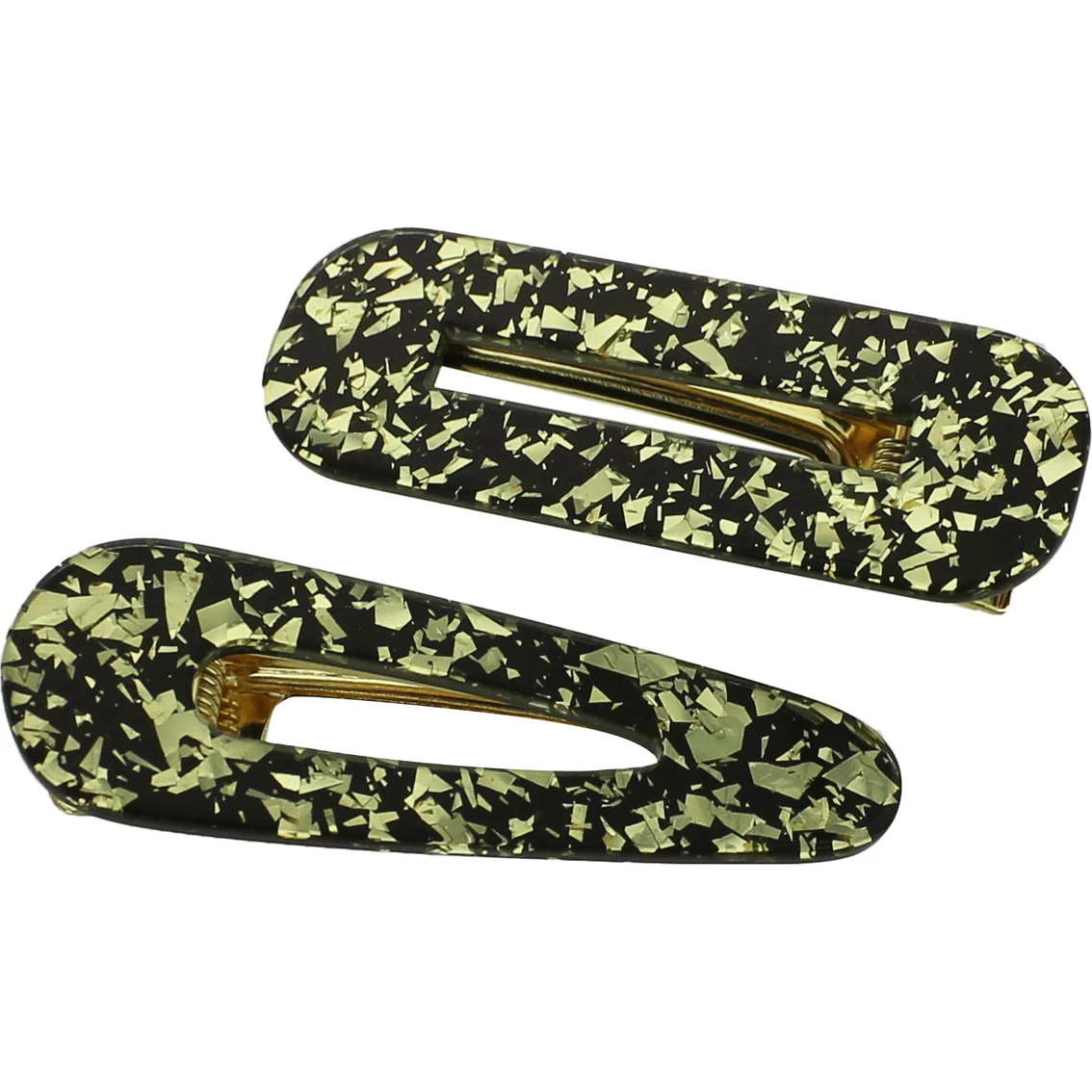 Panacea Resin Gold Foil Hair Clip Set is made with two alligator claw clips with gold foil speckled resin and a spring closure. One size fits all.