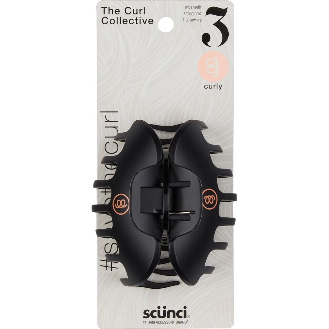 This sleek, matte jaw clip is the perfect combination of style and function. Part of the new Curl Collective line from Scunci, this jaw clip is specially designed for curly hair. The extra-widely spaced teeth and added No-Slip Grip will keep your curls in place and hold your hair gently yet firmly in place all day long.