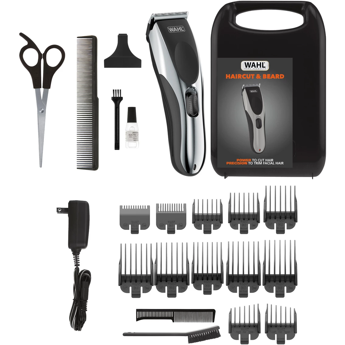 The Wahl Haircut and Beard Clipper Kit has the power to cut hair and the precision to trim facial hair. The self-sharpening precision blades are detachable for a quick and easy clean up! It is designed so that you can use it with or without the cord. The clipper is fast charging with a 60-minute run time on a full charge! Worldwide voltage 120-240V for home or international travel. It includes 12 individual secure fit guide combs and a left/right ear taper. The kit is completed with a styling hair comb, mustache comb, beard brush, scissors, blade oil, blade cleaning brush, and storage case. Model: 9639-2201.